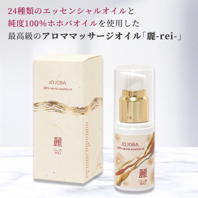 24種類の精油をブレンドした爽やかな香りと肌タイプを選ばない純度100%ホホバオイルを使用した最高級のアロママッサージオイル「麗-rei-」
