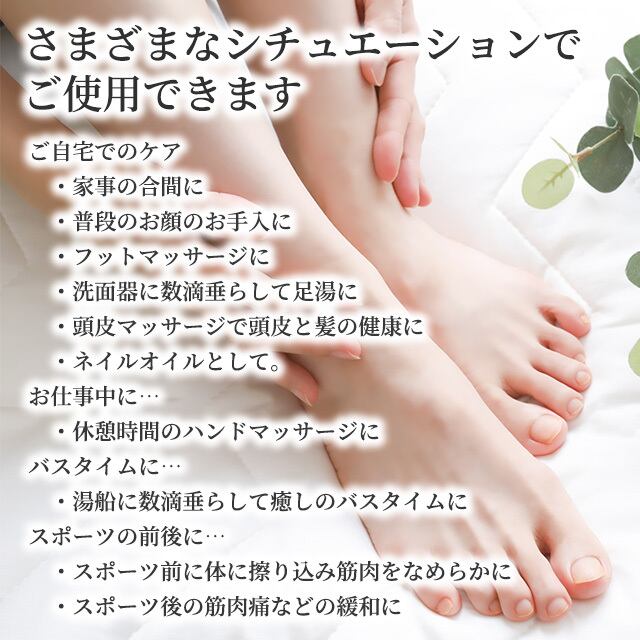 マッサージとして使用することで、各種オイルの効能により血液やリンパの流れを促進します。筋肉痛や肩こり、冷えやむくみの改善に最適です。デトックスやダイエットにも効果が期待できます。さらりとした使用感で、マッサージ後のベタ付きが苦手な方にもおすすめです。